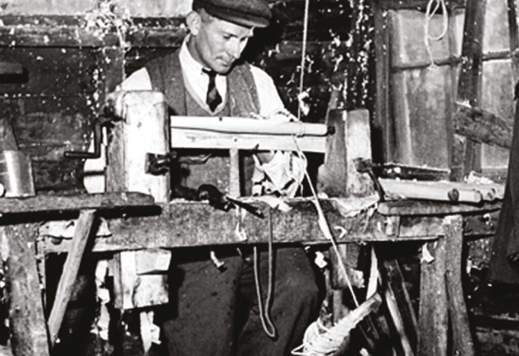 This classic wood chair was the staple product of the area, due to the abundant supply of locally grown timber. At this time there were still “chair bodgers” living in the woods around High Wycombe, who felled the beech trees and converted them into turned legs and parts and then sold them to the many chair factories in the town.