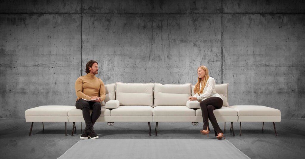 “Modular and linear, with a deceptively simple design, Anna blends into any setting. The sofa displays a functional and aesthetic self-confidence by matching the upholstered structural framework with the luxury of the soft seat and back cushions.” – Studio Verco