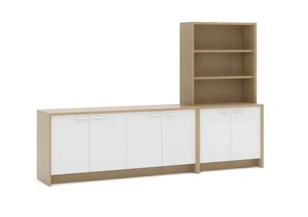 Featuring a crisp mitred corner and stylish reverse chamfer, the Aston executive storage units may be specified with a single wood veneer finish to the carcass, either oak or natural walnut and including a solid wood edge profile of the same finish, or in Ice White or black through-colour laminate with a solid wood edge profile. The drawer and door fronts may be specified separately in a choice of either oak or natural walnut, ice white or black laminate finish.