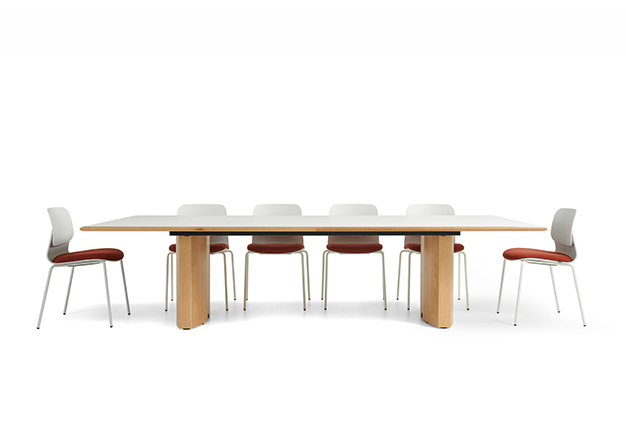 Rectangular panel ended meeting table with bright white laminate top finish and a solid ply core with crisp mitred corners