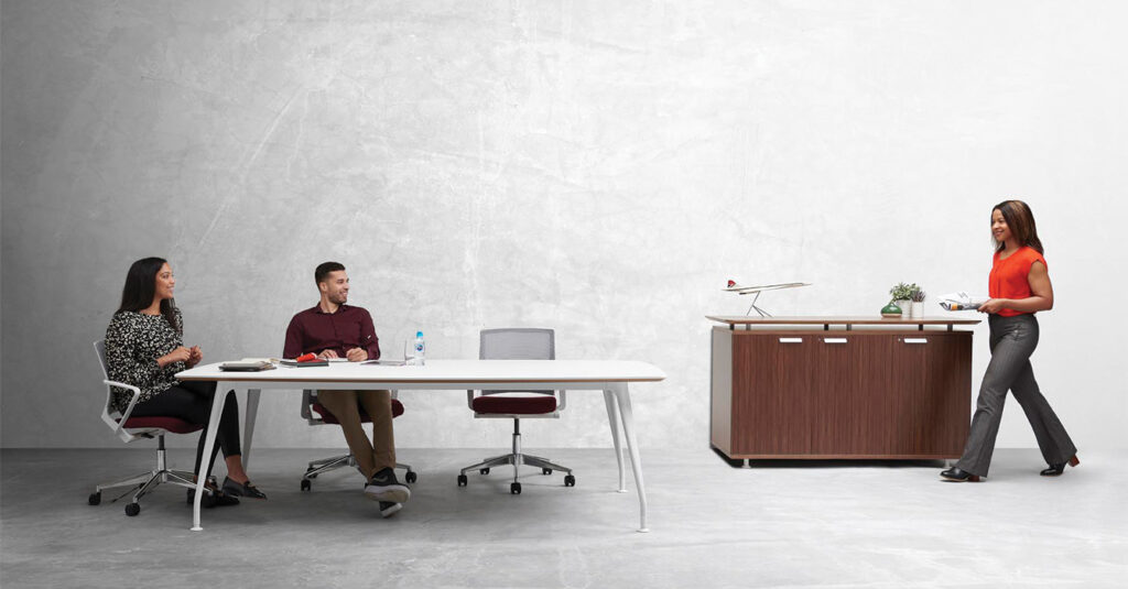 With a unique cast aluminium leg frame that has the ability to expand the tables to different sizes or depths with its simple linear form and clean lines, DNA defines the space it is placed in, whether that be the boardroom or the mailroom. This award-winning range, designed in collaboration with Roger Webb Associates, includes rectangular or circular meeting tables to adapt to diverse meeting styles and room layouts, while the spectrum of materials and finishes available displays the flexibility and craftsmanship at its heart.