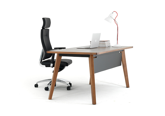 Martin’s leg frames come in solid oak or natural walnut, with desktops and optional modesty panels available in either matching real wood veneer or a combination of nanotechnology laminate with solid wood edge profiles. – Studio Verco