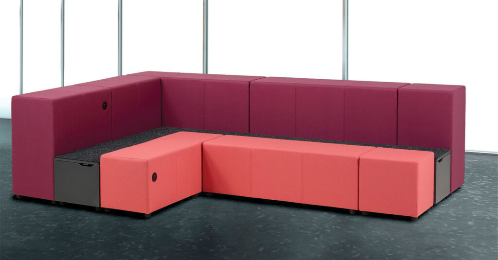 Double width, fully upholstered tiered seating unit with central graphite mfc storage locker